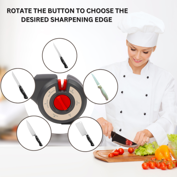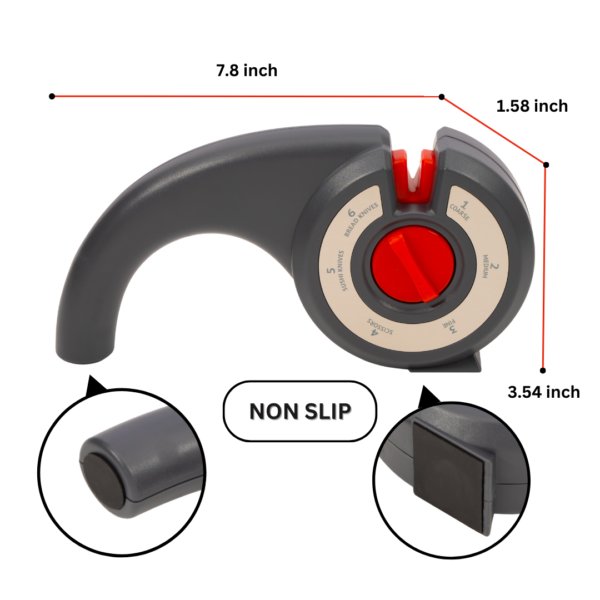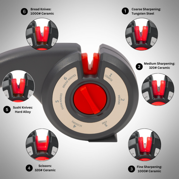 Return to ShopResQSharp knife sharpener adopts a multi-purpose design with 6 stages. Stage 1. Coarse: Suitable for grinding dull knives and repairing damaged blades; Stage 2 Medium: For semi-dull knives and ceramic knives; Stage 3 fine: to polish the knife; Stage 4 Scissors: To sharpen scissors; Stage 5 Sushi Knife: For sharpening sushi knives; Stage 6 Bread Knife: All bread knives for grinding. Different stages to meet different sharpening needs. You can use it as you wish.